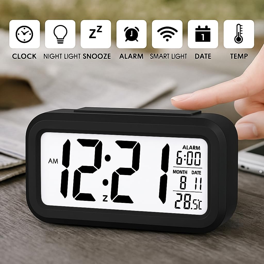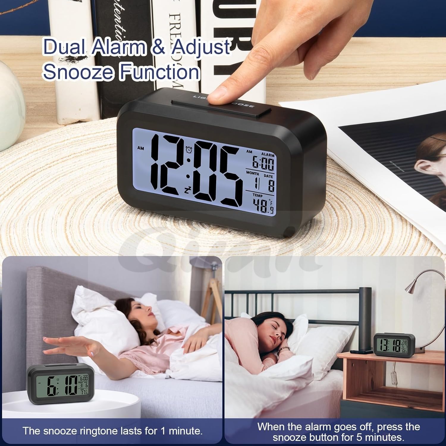This digital clock has a background light and an intelligent night light sensor system. When you switch on the backup "SENSOR" control button, the background light will turn on in low light conditions. Needless worry about the brightness, either too bright, thus affecting your sleep or too dark to read at night. During the day, you can always press the top light button to make the time more clearly visible.